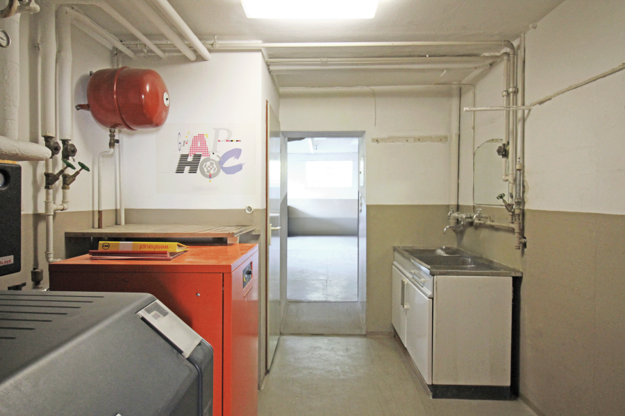 Im Untergeschoss stehen drei große Kellerräume zur Verfügung. Vom Heizraum gelangt man direkt in die geräumige Garage – mit Platz für Fahrzeuge, Werkbank und zusätzlichen Stauraum. Eine Montagegrube ist ebenfalls vorhanden.