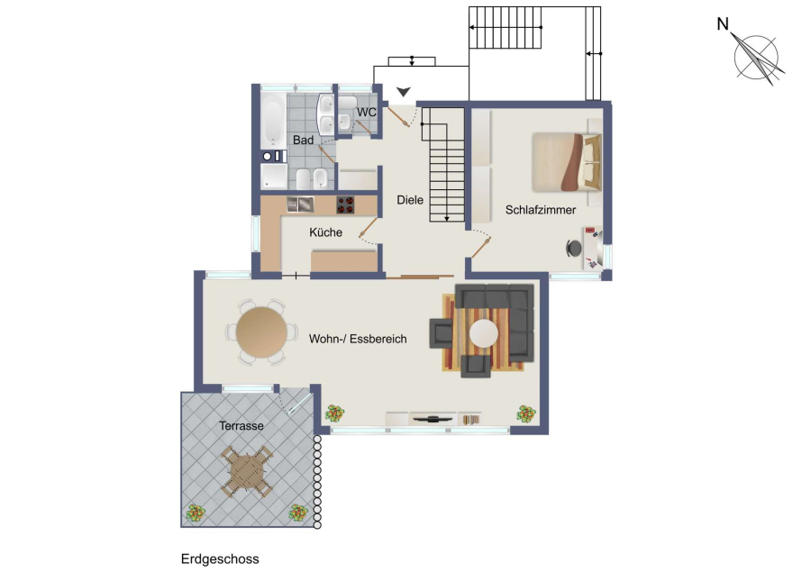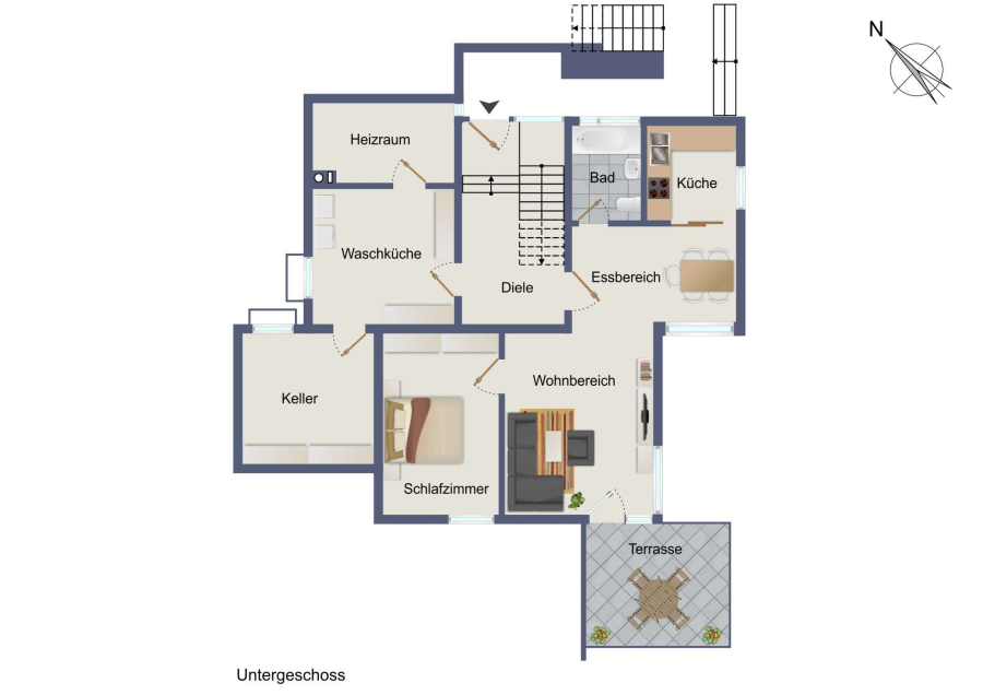 Die Immobilie ist funktional gegliedert in Untergeschoss mit separater Einliegerwohnung, Erdgeschoss als Hauptwohnebene und Dachgeschoss mit weiteren Zimmern und Bad.