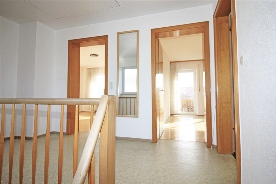 Im Obergeschoss befinden sich drei Schlafzimmer sowie ein Bad mit separatem WC. Zwei der Zimmer verfügen über direkten Zugang zum Balkon mit schönem Ausblick.