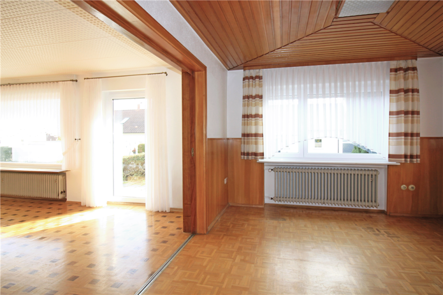 Das Haus erstreckt sich über zwei Ebenen. Im Erdgeschoss befindet sich das Wohnzimmer mit großer Fensterfront und Zugang zur sonnigen Südterrasse. Die Holzvertäfelung an Wänden und Decke verleihen dem angrenzenden Esszimmer einen warmen, rustikalen Charakter.