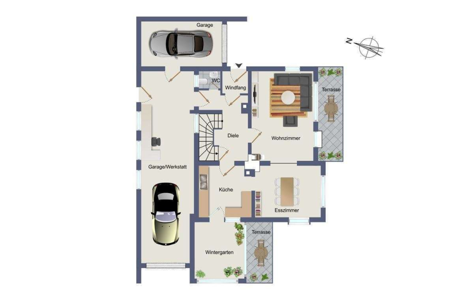 Zum Haus gehören zwei Garagen: eine Garage direkt am Haupteingang und eine zweite, ca. 13,75 Meter lange Garage hinter dem Gebäude – ideal für mehrere Fahrzeuge oder auch als Heimwerkstatt nutzbar.