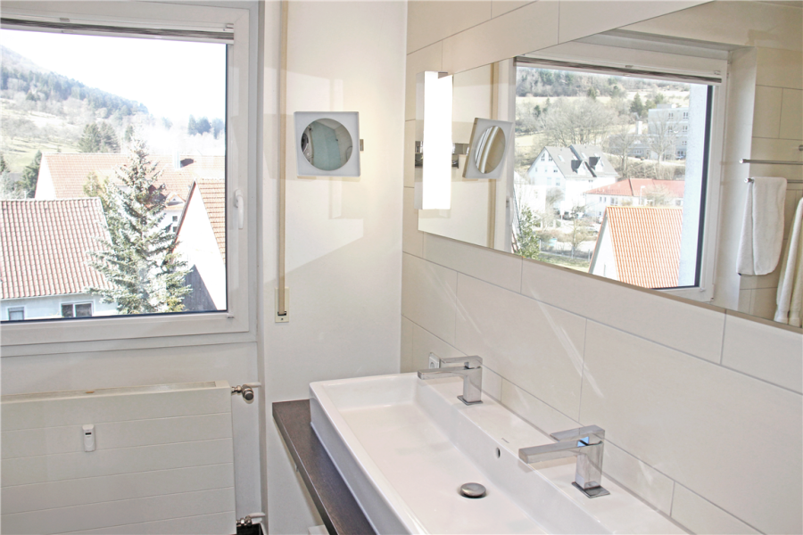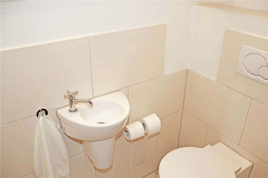 Das modernisierte Tageslichtbad ist mit Doppelwaschtisch und bodengleicher Dusche ausgestattet. Die Waschmaschine kann im Bad aufgestellt werden. Das separates WC wurde ebenfalls modernisiert.