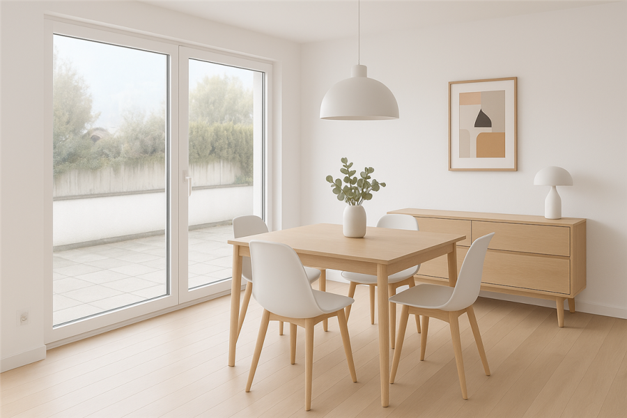 Der offene Wohn- und Essbereich bildet den Mittelpunkt der Wohnung und bietet direkten Zugang zur großen Dachterrasse. Die angrenzende Einbauküche ist funktional integriert.