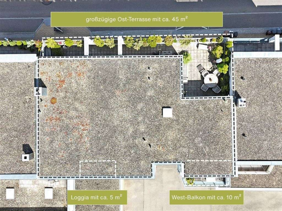 Helle Penthouse-Wohnung mit ca. 60 m² Außenfläche: Große Dachterrasse, Loggia und Balkon